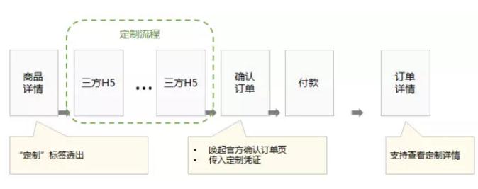 阿里零售平台允许商家在商品详情页展示自己开发的H5页面,让消费者进行个性化选择/DIY,定制确认后,商家和平台同时记录消费者个性化定制的信息,包括定制商品交易快照和定制识别码。