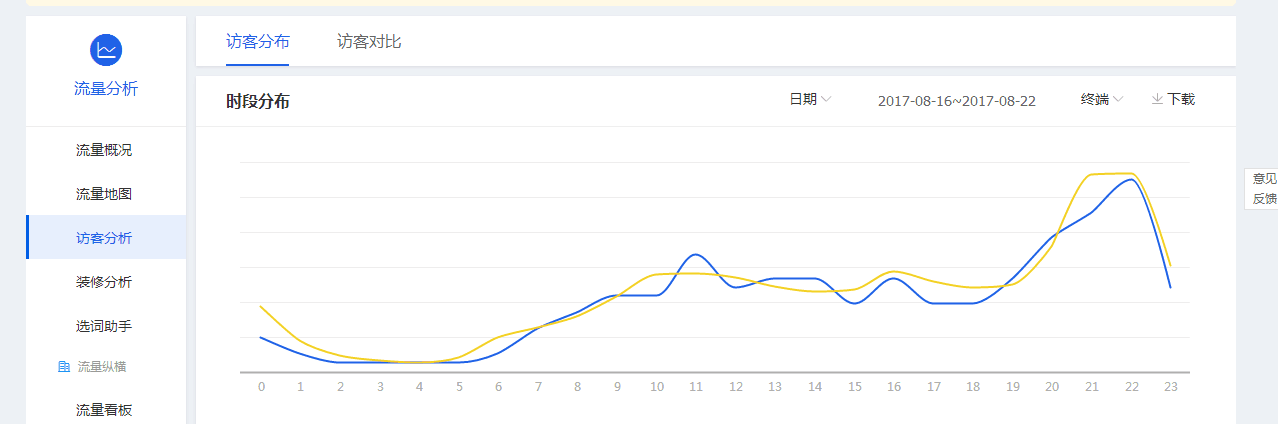 这里面关键是时间点的选择打开生意参谋在“经营分析”模块,看一下“访客分析”里面的第一个时间段分析: